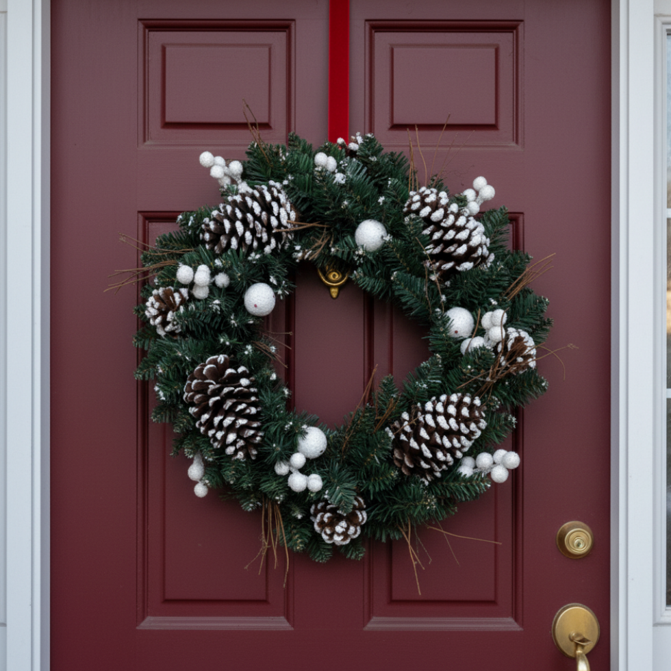 Con ramas verdes de pino, piñas nevadas y delicadas bayas blancas, evoca la pureza del invierno y la calidez de las fiestas.