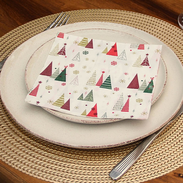 Dale un aire natural y festivo a tu mesa con este pack de servilletas navideñas con diseño de pinos en tonos verdes, rojos y dorados.
