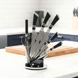 El Taco de Cuchillas Kitchen Pro combina diseño contemporáneo con rendimiento profesional. Fabricado en acero inoxidable pulido, con mangos en negro mate y base giratoria, es el set ideal para quienes disfrutan cocinar con estilo y practicidad.