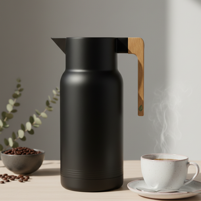 La Jarra Térmica Arctic Negra combina sofisticación moderna y diseño nórdico en una pieza que realza cualquier mesa. Su acabado mate en negro profundo transmite elegancia, mientras que el mango en símil madera aporta un contraste natural y funcional.