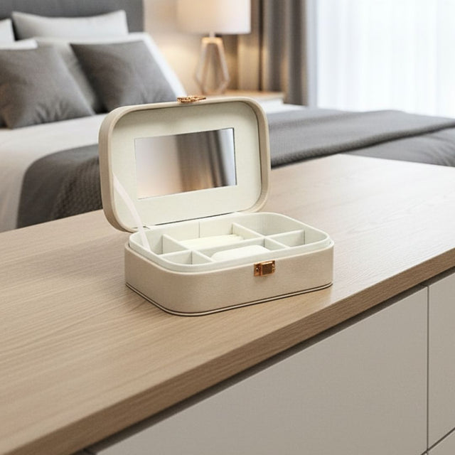 - Tapa con espejo integrado, perfecto para probarte tus joyas en cualquier momento.