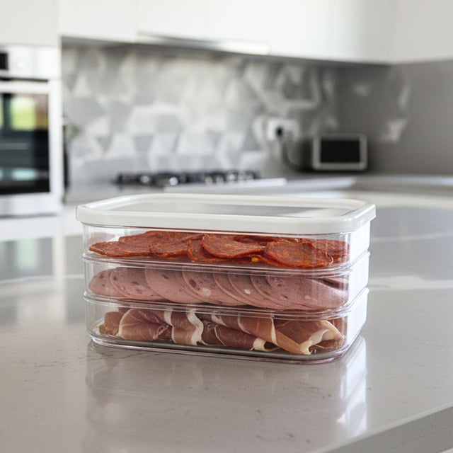El Food Storage 3 Niveles Simple Life te permite mantener tus alimentos frescos y perfectamente organizados gracias a su diseño apilable de tres niveles. Ideal para optimizar el espacio en la heladera o alacena, combina funcionalidad y estética minimalista, característica de la colección Simple Life.