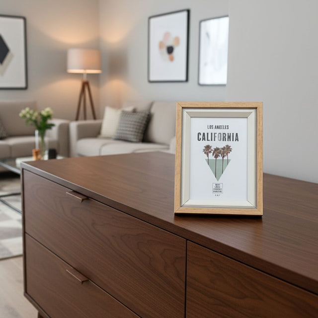 El Portarretratos California – 13x18 cm combina el encanto del estilo urbano con la frescura de la costa californiana. Con marco box en madera clara y diseño interior con palmeras y tipografía moderna, aporta un aire cosmopolita y relajado que transforma cualquier rincón en un espacio con personalidad.