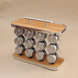 Capacidad para 12 frascos de vidrio con tapas de acero inoxidable, ideales para almacenar y organizar una variedad de especias.